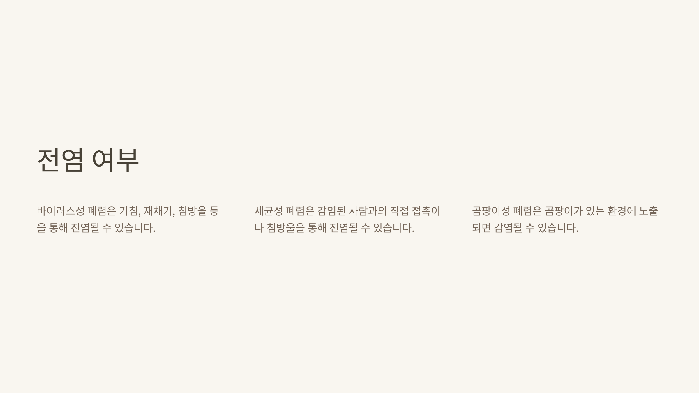 A3. 네, 바이러스성이나 세균성 폐렴은 감염될 수 있어요. 기침, 재채기를 통해 전파될 수 있으니 주의해야 해요.
