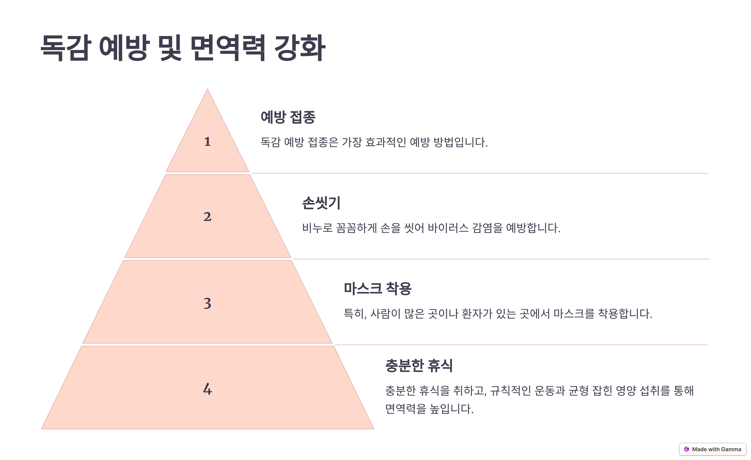 💪 독감 예방접종 맞기: 매년 독감 예방접종을 맞으면 감염 위험을 크게 줄일 수 있어요.