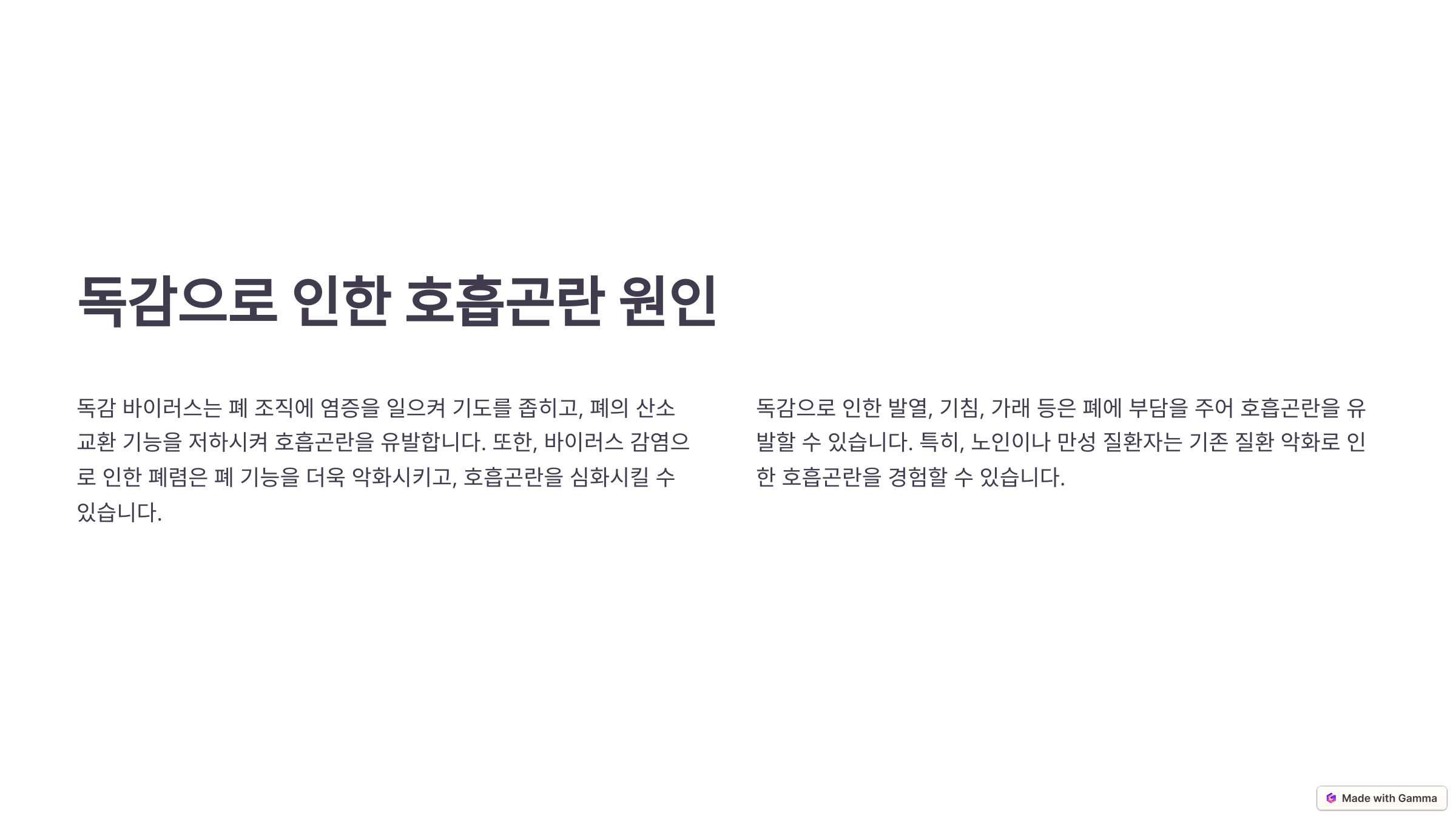 🔹 세균 감염 합병증: 독감으로 면역력이 약해지면 폐렴구균 같은 세균이 폐를 감염시켜 호흡곤란을 유발할 수 있어요. 특히 고령자나 만성질환자는 위험이 높아요.
