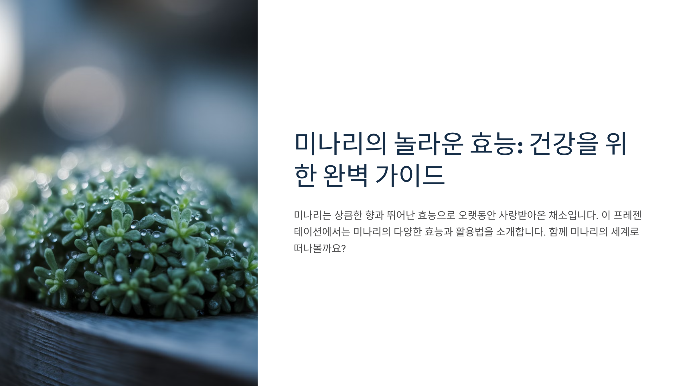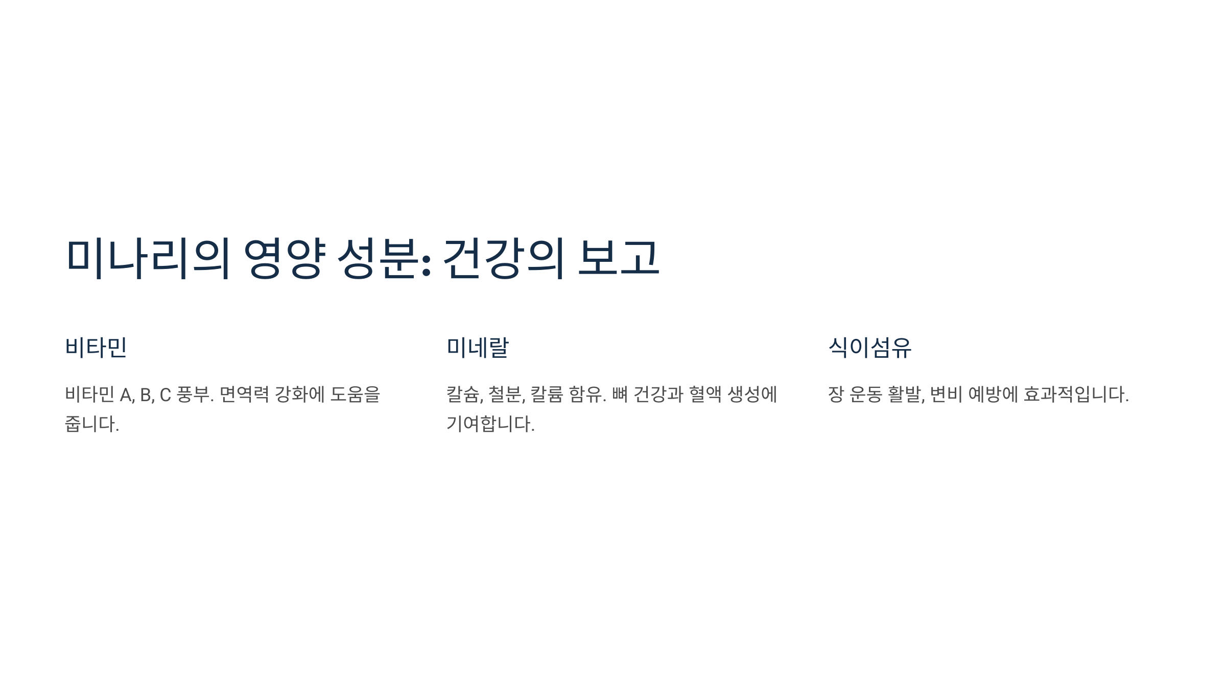 다음 섹션에서는 미나리에 들어 있는 영양 성분을 살펴볼게요! 🥗
