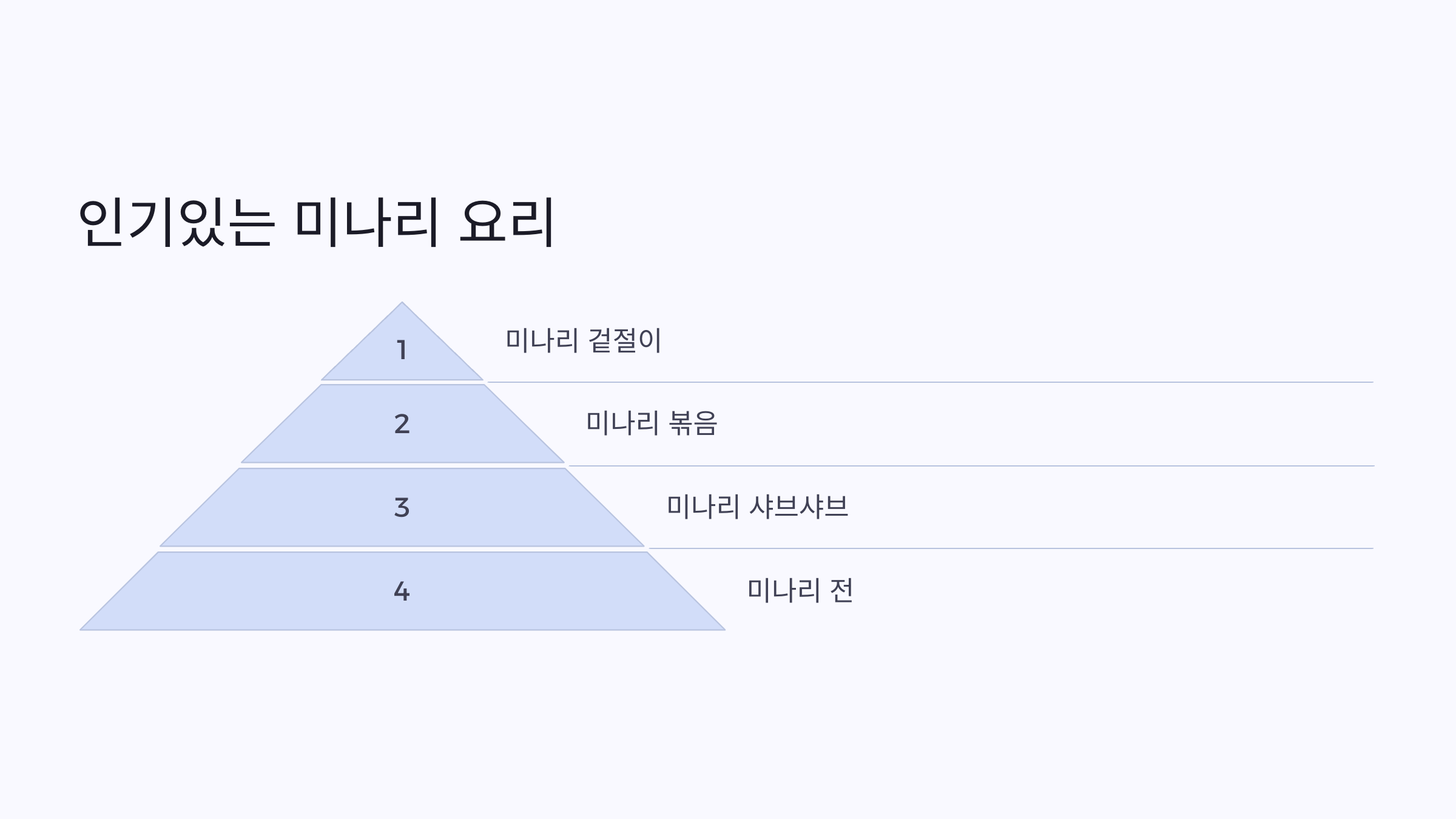 | 미나리 볶음 | 간단하면서도 아삭한 식감이 좋은 볶음 요리 | 마늘, 간장, 참기름 |