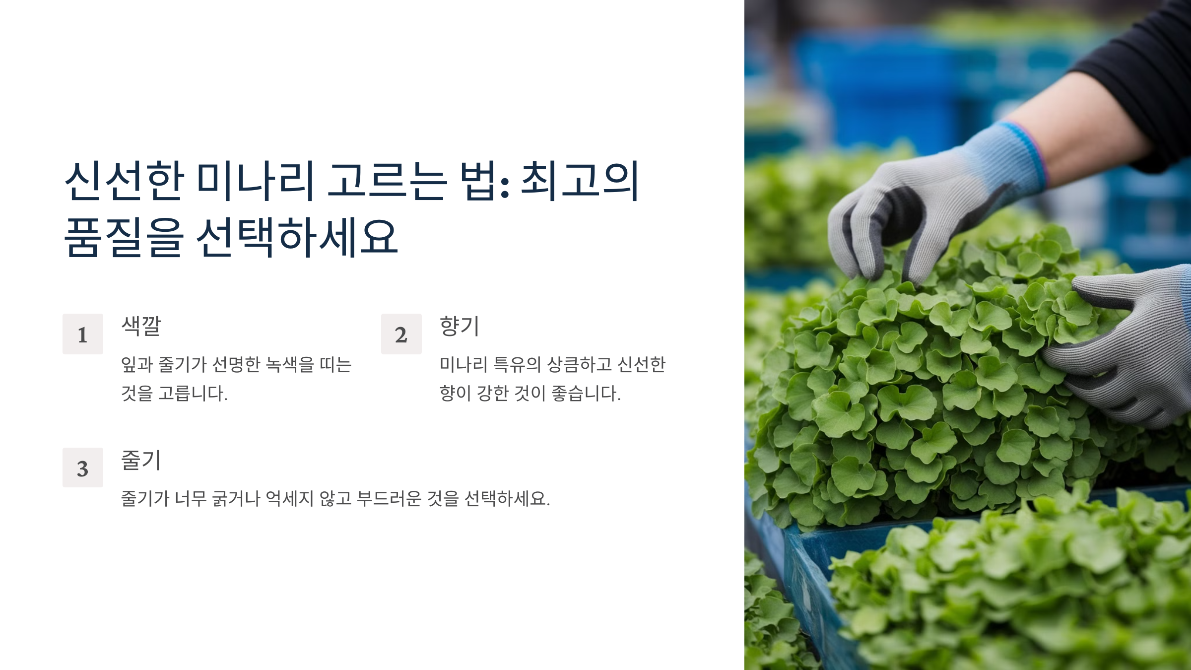 다음 섹션에서는 신선한 미나리를 고르는 법을 알려드릴게요! 🛒