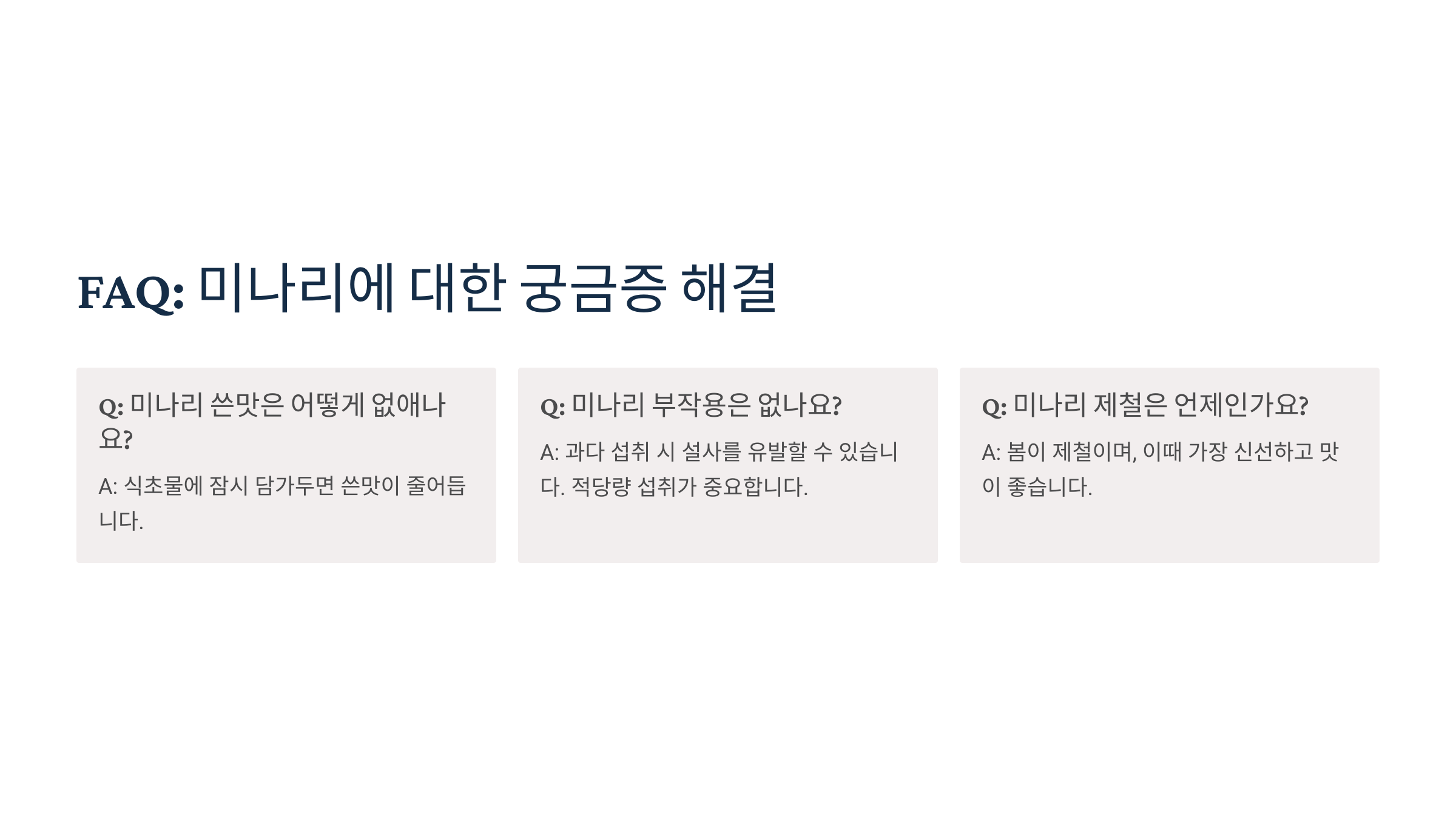 다음 섹션에서는 미나리에 대한 자주 묻는 질문(FAQ)을 정리해볼게요! 🧐