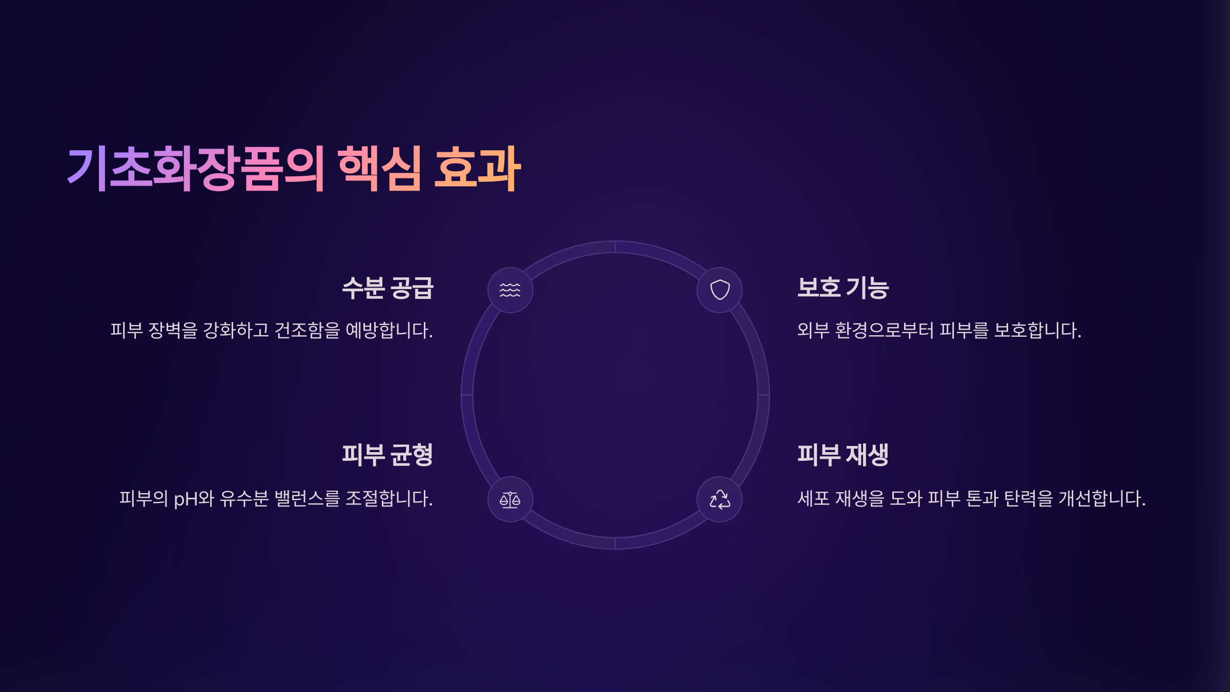 가장 기본적인 기능은 보습이에요. 토너와 로션, 에센스 또는 크림을 통해 수분을 공급하면 피부 장벽이 무너지지 않게 도와줘요. 수분 부족은 잔주름, 트러블, 각질 등 다양한 문제의 시작이기 때문에 첫 단계에서 충분히 케어해줘야 해요.