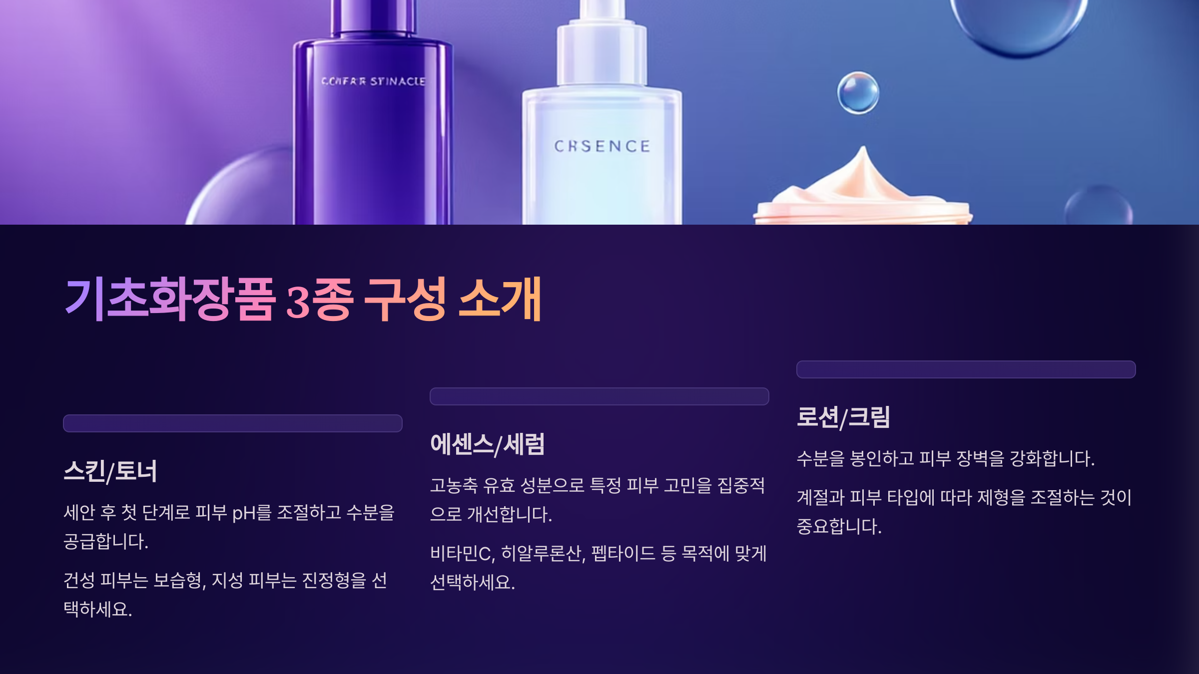 요즘은 날씨도 건조하고 미세먼지도 심해서 피부가 쉽게 지치고 예민해지기 쉬워요. 이럴 때일수록 피부의 기초 체력을 키워주는 스킨케어가 정말 중요하답니다. '기초화장품 3종'이라고 하면 보통 '토너, 로션, 에센스' 또는 '스킨, 에멀전, 크림' 구성을 많이 떠올리는데요.