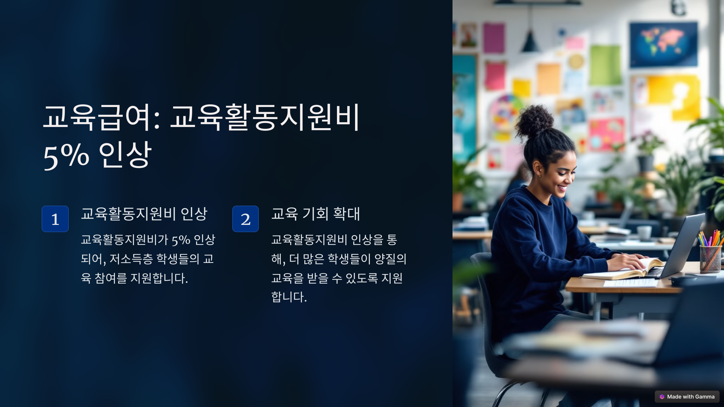 교육급여 지원 금액도 인상돼요! 2025년부터 초·중·고등학생의 교육활동지원비가 5% 인상됩니다. 💡